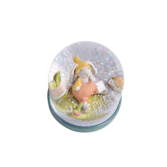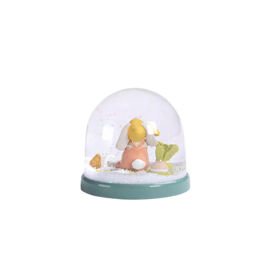 Une jolie boule à neigeMoulin Roty dans laquelle sont représenté un lapin et ses amis. Les voilà au jardin, au milieu des flocons, se partageant radis et petits secrets !