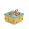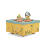 Boîte à musique aux couleurs de la gamme, illustrée d'un joyeux paysage composé de plantes, légumes et petits oiseaux du jardin. Le lapin et la tortue tournent et dansent sur la piste pour bercer et endormir bébé.