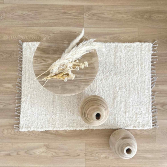 Ce joli tapis en coton, tissé entièrement à la main, apportera une touche d'originalité à votre décoration.
