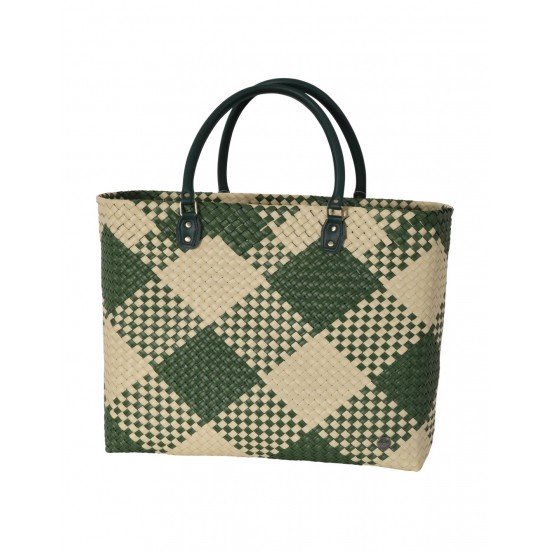 Fabriqué à la main à partir de plastique recyclé, ce grand panier séduit par son look chic et durable. Sa teinte écru foncé à motif lui confère une élégance naturelle, tandis que ses poignées en simili cuir offrent confort et solidité.