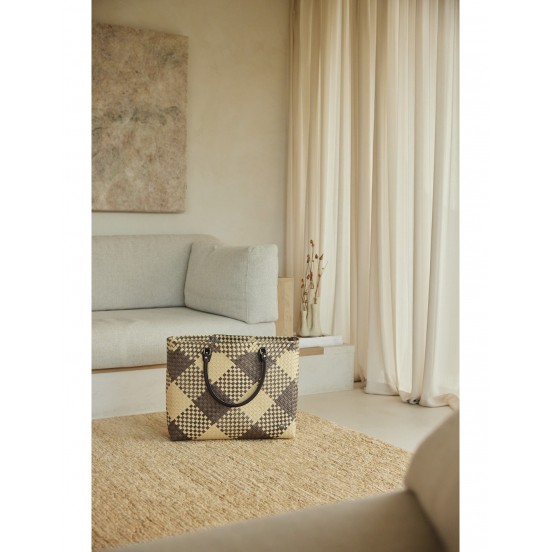 Tissé à la main à partir de plastique recyclé, ce grand panier séduit par sa teinte taupe intemporelle et ses poignées en simili cuir, parfaites pour un porté confortable. Sa grande capacité en fait l’allié idéal du quotidien, que ce soit pour le marché, le travail ou les escapades du week-end.