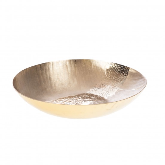 Cette coupelle ronde grand modèle est une pièce lumineuse qui allie style et fonctionnalité. En aluminium doré à la finition martelée, elle attire le regard par sa texture raffinée et son éclat subtil.