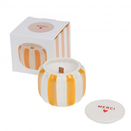 Dites-le avec chaleur et éclat ! La Bougie décorative "Merci Ella" est le présent idéal pour exprimer votre gratitude avec style. Arborant un design graphique à rayures blanches et orange, cette bougie apporte une touche de peps immédiate à votre décoration intérieure.
