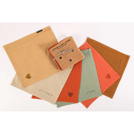Redonnez ses lettres de noblesse à l'art de recevoir. Ce lot de 6 serviettes de table apporte une touche de poésie et de raffinement à votre quotidien. Chaque serviette est ornée d'un délicat cœur brodé, signature de la créatrice, qui transforme un objet fonctionnel en un véritable élément de décoration. Confectionnées dans des matières naturelles de haute qualité, ces serviettes sont pensées pour durer et pour embellir vos tablées, qu'il s'agisse d'un déjeuner dominical en famille ou d'un dîner romantique.