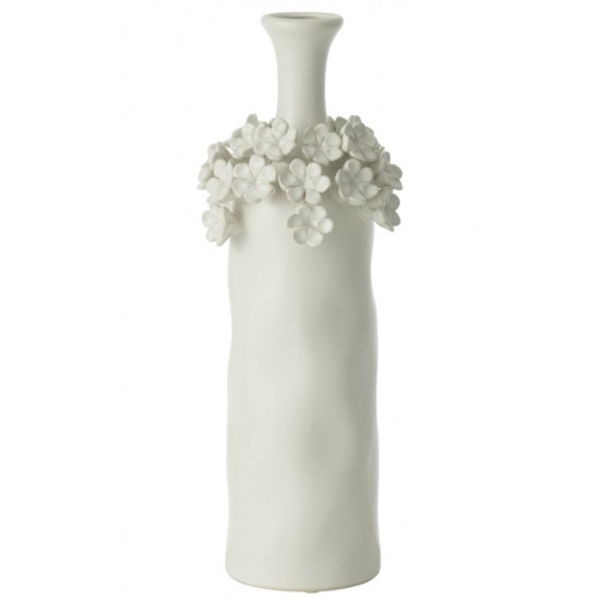 Sa robe en céramique blanche immaculée met en valeur chaque pétale stylisé en relief. C'est une pièce qui joue avec l'ombre et la lumière : selon l'heure de la journée, les reliefs du vase se dessinent différemment, apportant une dynamique constante à votre pièce.