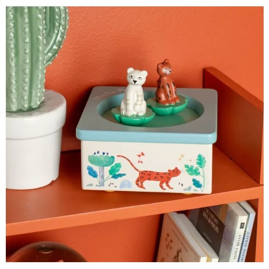 Laissez la magie opérer... Au son d'une berceuse délicate, les deux petits personnages Baboo et Taïgo s'animent et virevoltent sur leur piste de danse illustrée. Cette boîte à musique magnétique est un véritable spectacle miniature pour les yeux et les oreilles de votre enfant.