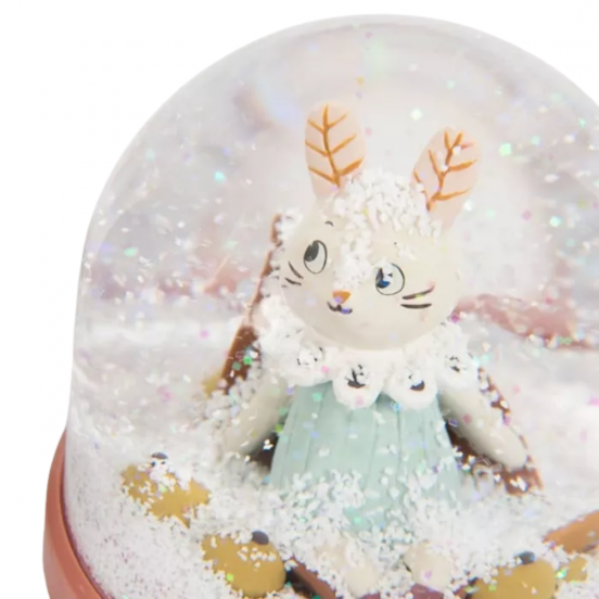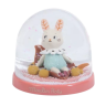 Une jolie boule à neige Moulin Roty avec figurine en résine et socle en plastique où un adorable lapin posé dans une feuille d'automne, regarde les flocons tomber tout autour de lui…