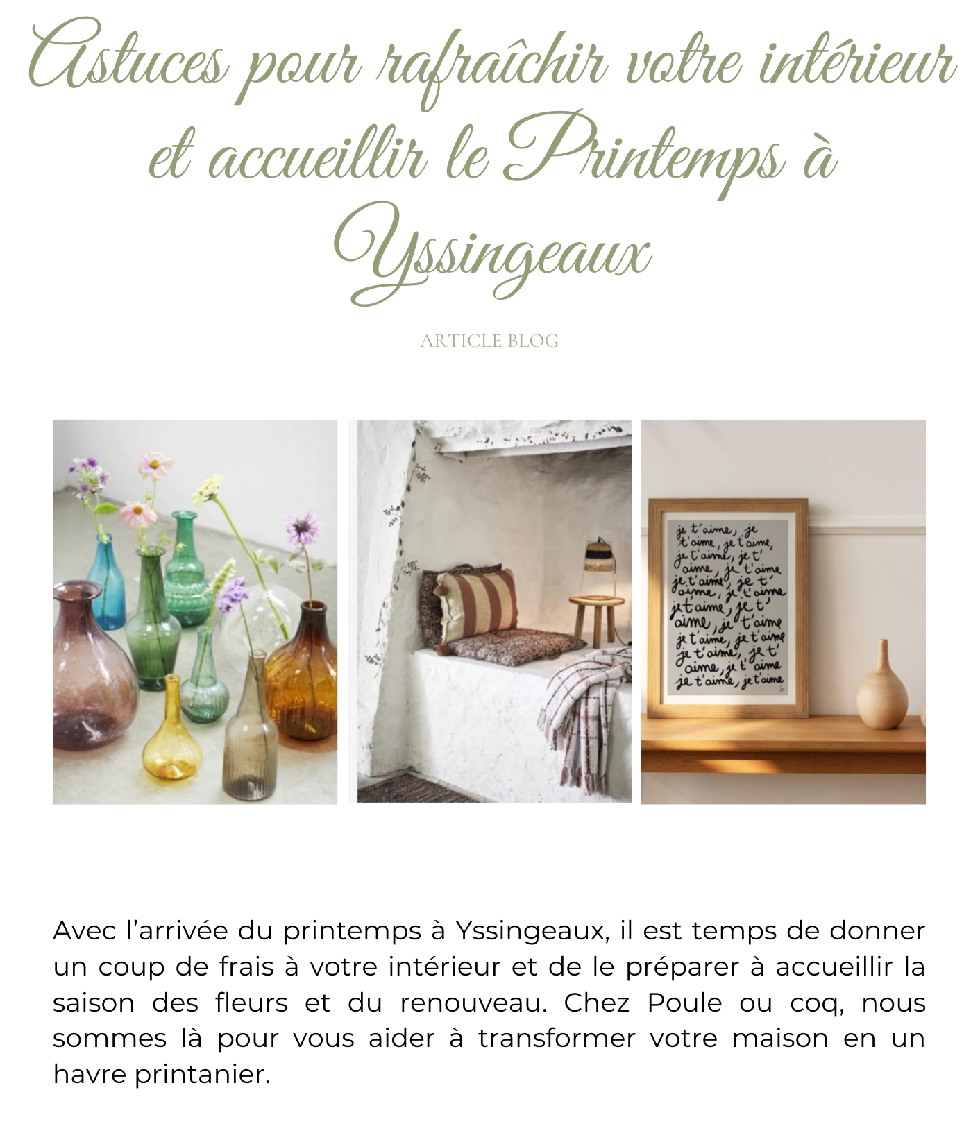Avec ces quelques astuces simples, vous êtes prêts à accueillir le printemps à bras ouverts dans votre maison à Yssingeaux. Chez Poule ou coq, nous avons tout ce dont vous avez besoin pour donner vie à vos idées de décoration printanière. Venez nous rendre visite et laissez-vous inspirer par notre sélection de meubles et d'accessoires qui apporteront une touche de fraîcheur à votre intérieur.