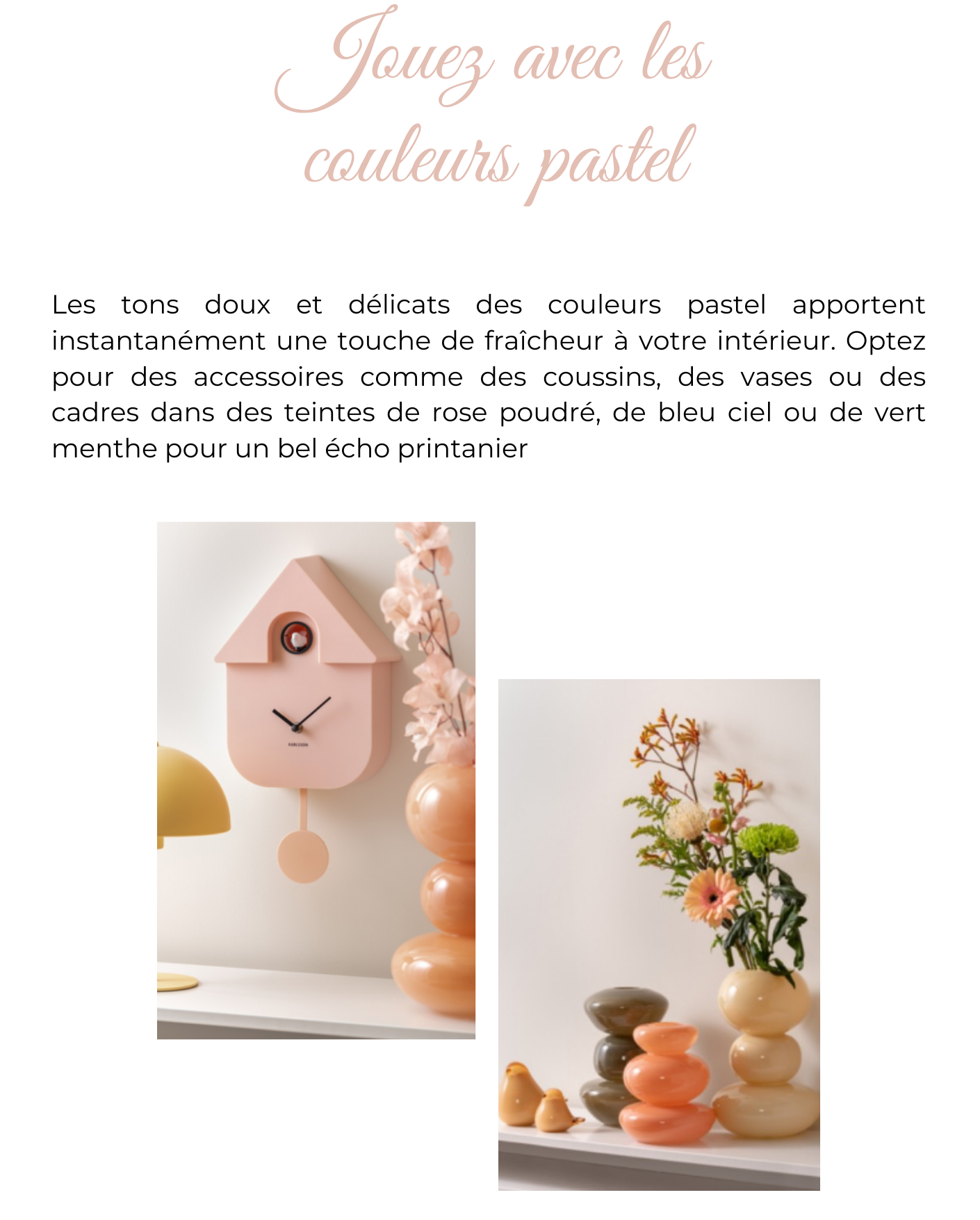 Renouvelez votre décoration murale : Accrochez de nouveaux tableaux, des miroirs ou des cadres pour donner un coup de neuf à vos murs. Optez pour des œuvres d'art inspirées de la nature ou des paysages printaniers pour apporter une touche de poésie à votre décoration.