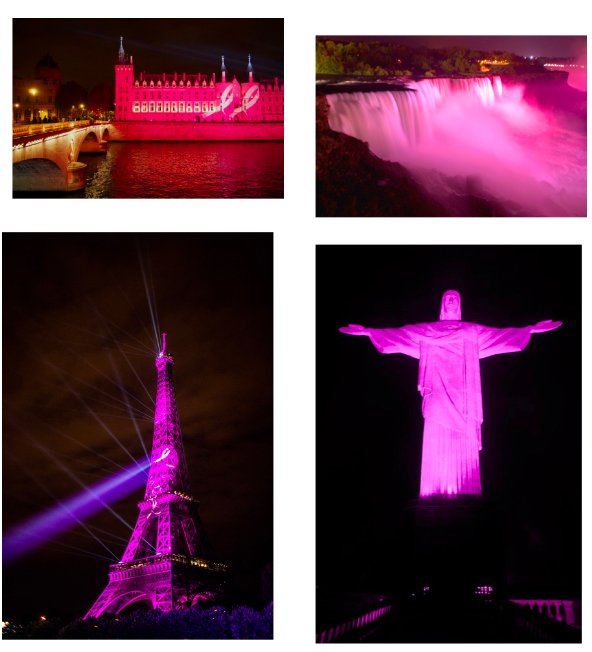 En images, ci-dessus, et dans l’ordre : La Conciergerie à Paris, Les Chutes du Niagara au Canada, La tour Eiffel à Paris ou encore le Christ Rédempteur, à Rio de Janeiro au Brésil. (source cancerdusein.org )